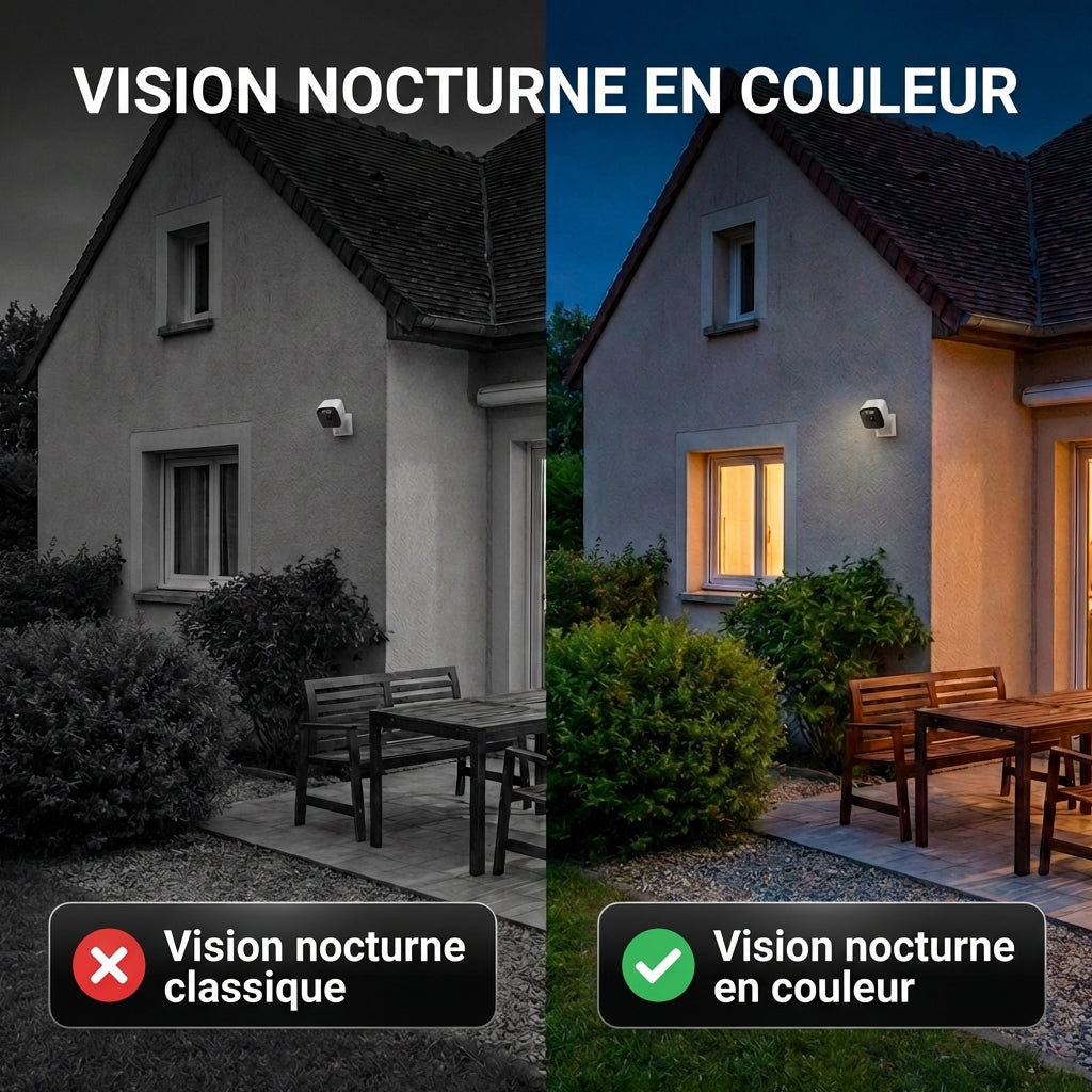 Oui, la caméra dispose d’une vision nocturne IR + couleur. Le rendu peut varier selon l’éclairage extérieur et l’environnement, mais elle reste très utile pour surveiller votre entrée ou votre extérieur de nuit.