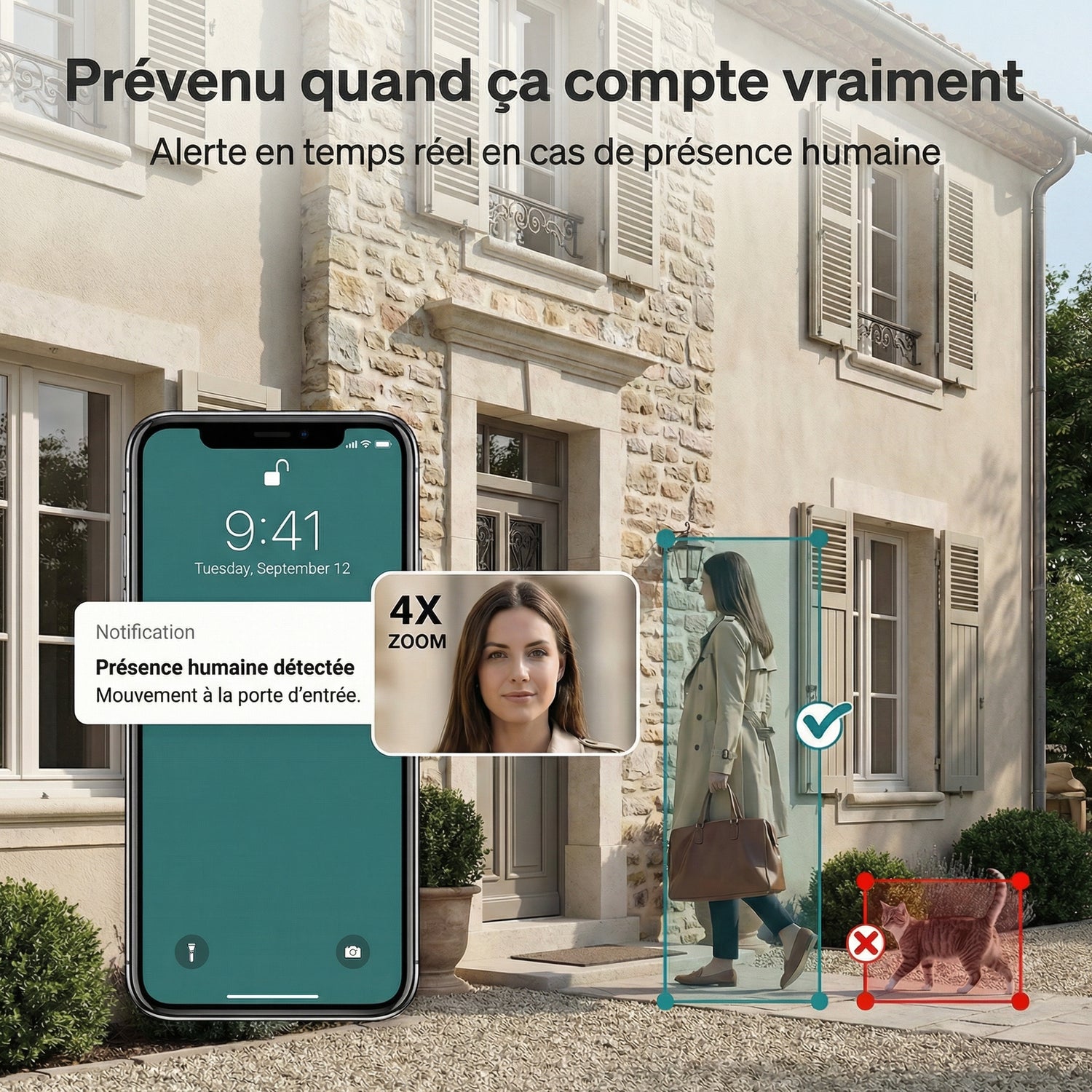 La caméra détecte la présence humaine et vous envoie une alerte lorsqu’un mouvement important est repéré.